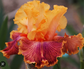 Без сомнения самый яркий цветок! Пылающие оранжевые стандарты, яркие рубиновые красные фолы - испещренные прожилками цвета апельсина с более легким оранжевым образованием прожилок вокруг пламенных бород моркови. Фолы имеют оранжевую окантовку.