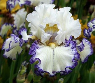 Яркая и сияющая звезда. Этот ирис ярко сияет через весь сад с его девственно - чистыми белыми цветами, с фолами, узко прошитым фиолетовым краем. Стебли имеют 2 ветви и 7 бутонов. Богатая гофрировка придает ему особый шарм. Сильный пряный аромат повышает его звездный рейтинг.