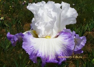 S - белоснежные взбитые сливки, F - белые, с нарядным, мраморным сине-фиолетовым краем, бородки ярко-желтые, солнечные. Сильно гофрированный и кружевной. Раскошная форма! Очень красивый!
