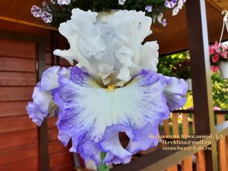 S - белоснежные, F - в тон стандартов, потрясающая широкая кайма из лавандово-синих прожилок, штрихов и лучиков. В - золотая, кончик белый.