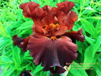 Красно- коричневые цветы с более темно-бархатистыми, широкими фолами, Б- цвета старого золота. Красивый цвет и форма. Очень гофрированный!