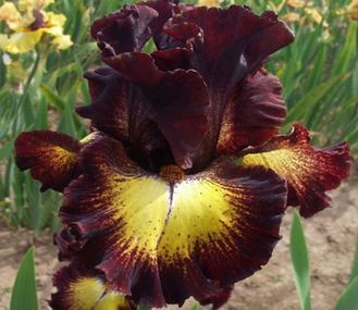 S темно-бордово-красные с желтыми вкраплениями по центру. F желтые с широкой тёмно-бордово-красной каймой. Б и кайма цвета С. Гофрированный.