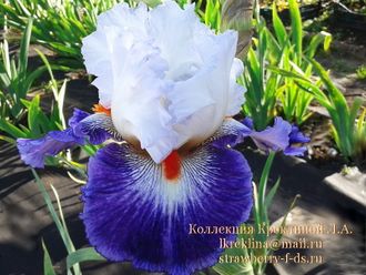 С- белые. Ф- темно- сине- сиреневые с большой областью из белых лучей вокруг ярко- красных Б.   Крупный гофр. Очень нарядный цветок!