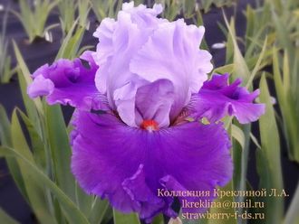 Белые с голубоватым оттенком стандарты, розовато лавандовые фолы с более светлым краем и оранжево красной бородкой. Крупный и очень гофрированный. Очень красивый ирис!
