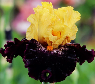 Цветение позднее. Стандарты и стебли золотисто-жёлтые; фолы насыщенно-чёрно-вишневые, короткие белые штрихи по обеим сторонам бородки; бородки оранжевые; приятный мускусный аромат.