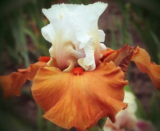 Белые S с розовыми оттенками по средней жилке, F - насыщеннo -тыквенно-оранжевые, с горящей красной бородкой. Уникальная расцветка!!!