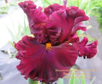 Насыщенно черно-бордово – коричневый ирис с синими проблесками под темно – золотистыми бородками.