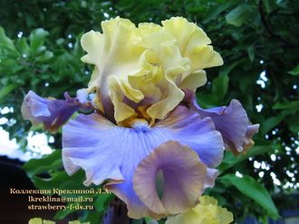 С – волнистые, желтые с серо-лавандовым вливанием по центральной жилке. Ф– лавандо-фиолетовые, окаймлённые коричнево-желтой гофрированной оборкой и такого же цвета плечиками. Крупный. Изысканный и элегантный!