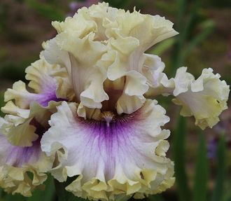 светло-фиолетовое пятно вокруг бородки. Сильно гофрированный цветок. Очень красивый!