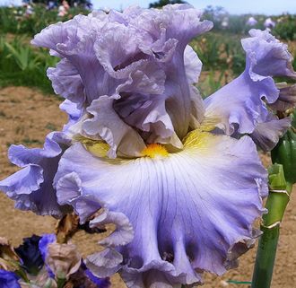 Стандарты светло-лавандово-голубые, кайма светло-кремово-серая. Фолы светло-лавандово-голубые, более светлый центр, немного лимонного цвета у бородок, кайма светло-кремово-серая. Волоски бородки в основе кремово-лимонные, кончики светло-лимонно-мандариновые. Очень волнистый и гофрированный. Имеет лёгкий сладкий аромат. Цветение позднее.