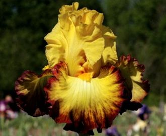 Насыщенно-желтый цветок с легким белым пятнышком у основания и широкой бордово-коричневой каймой на фолах. Б – желтая. Замечательно гофрированный! Крупный, яркий!