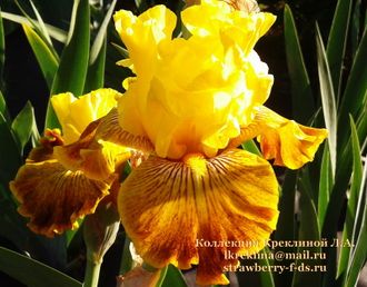 Очень яркий ирис! Ярко-желтые стандарты, фолы желто-золотые, испещрённые тонкими красными прожилками. Около желтой бородки небольшое белое основание. Сильно гофрированный и кружевной! Отличный сорт по кружевам и яркости!