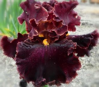 Крупный и кружевной насыщенно-винно-красный цветок с блестящим медным переливом. Б - жёлто-оранжевая. Гофрированный, плотной текстуры цветок.