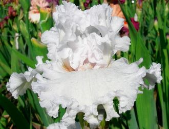 Великолепный белоснежный ирис, на крепких цветоносах гофрированные кружевные широкие цветы с плотной текстурой лепестков, оранжевой бородкой с белым кончиком. Шикарный!