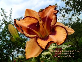 75/17 Абрикосово-желтый с большим черно- фиолетовым глазом и такой же широкой гофрированной каймой, горло жёлто- зеленое.
