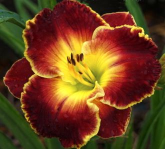 76/16,5 Зеленое горло, большой лимонный глаз на фоне ярких бархатистых красно-алых лепестков и лимонно- золотистой отлично гофрированной каймой.