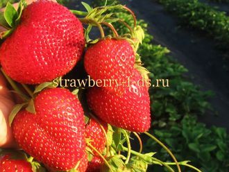 Ягоды крупные, конической формы, ярко-красного цвета, мякоть сочная, сладкая, ароматноя. Форма и цвет одинаковы на протяжении всего периода сбора.